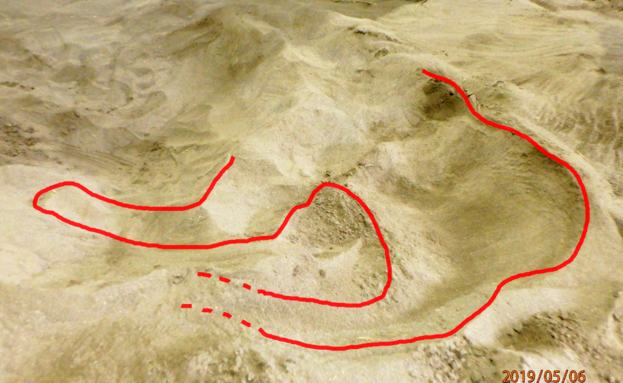 わからない方のためにヒントです。痕跡の輪郭を赤い線でなぞってみました。