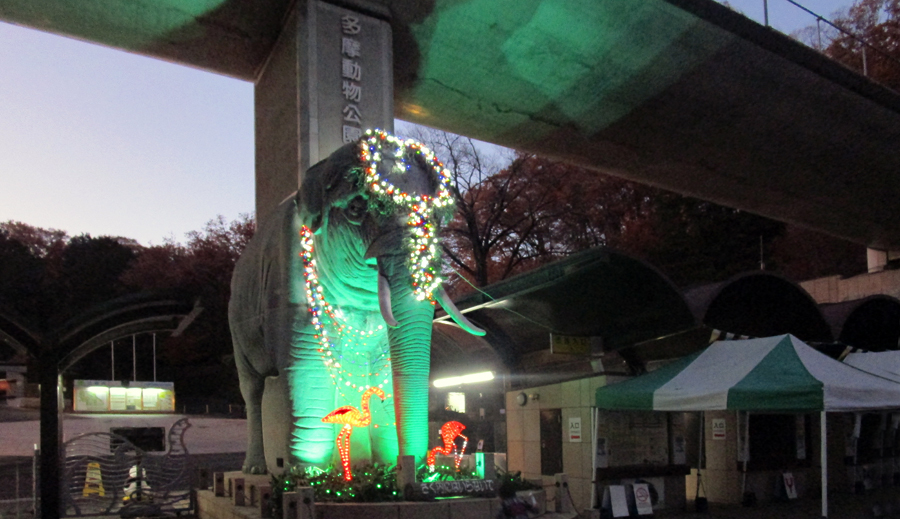 多摩動物公園の正門でみなさんをお出迎えする大きなゾウ。そのゾウが今、イルミネーションでデコレーションされています。直径1メートルほどのリース飾りは、園内に生育させているユーカリやモミノキの枝葉を使って、施設係の職員が力を合わせて手作りしました。