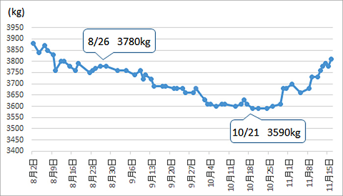 秋といえば「食欲の秋」。おいしい物の食べ過ぎで体重を気にされている方もいらっしゃるかもしれません。本格的な冬の寒さに向かうこの時期に食欲が増すのは人間以外の動物でもよく見られる行動です。多摩動物公園のアジアゾウのオス「アヌーラ」もこの時期になると食欲が増しますが、年間の推移は人間とは少し異なっています。