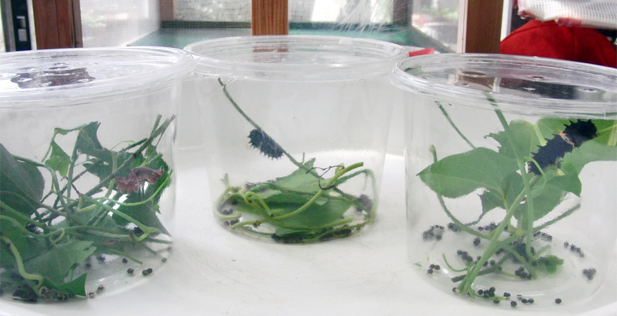 今年度ふたたびベニモンアゲハの担当となりました。前回の失敗を踏まえ、使用済みの飼育箱の消毒、飼育室のこまめな換気、4齢幼虫以降の個別飼育をおこなっています。今のところ病気が広がることなく、順調に飼育しています。