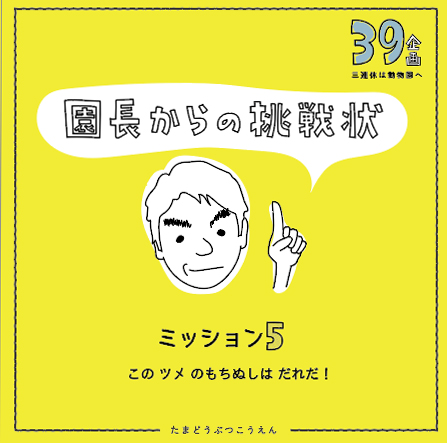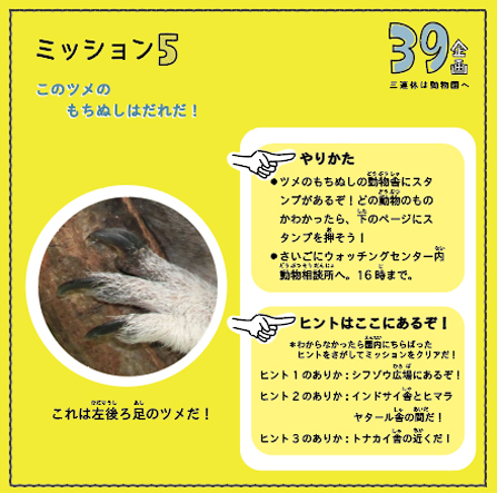 正門前広場で配布している「挑戦状」を受け取り、ミッションに挑戦してもらいます。正解の動物舎に置いてあるスタンプを挑戦状に押し、ウォッチングセンターに持ってくると見事ゴールイン。ミッションの内容は連休ごとに変わります。直近の挑戦状の内容は、2019年10月12日〜14日に開催した「このツメのもちぬしはだれだ」でした。