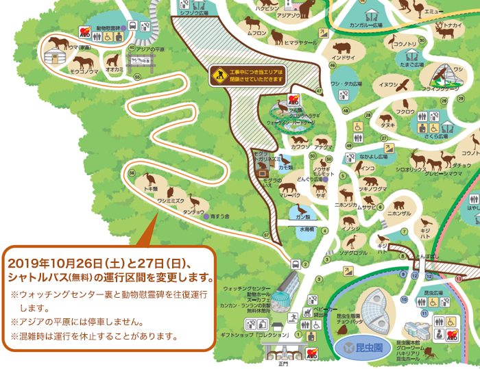 多摩動物公園では2019年10月26日(土)と27日(日)、「第5回都立動物園アフリカフェア」を開催します。開催期間中、シャトルバスは終日、ウォッチングセンター裏臨時バス停から動物慰霊碑バス停までの間を往復運行します。ご迷惑をおかけしますが、ご了承ください。