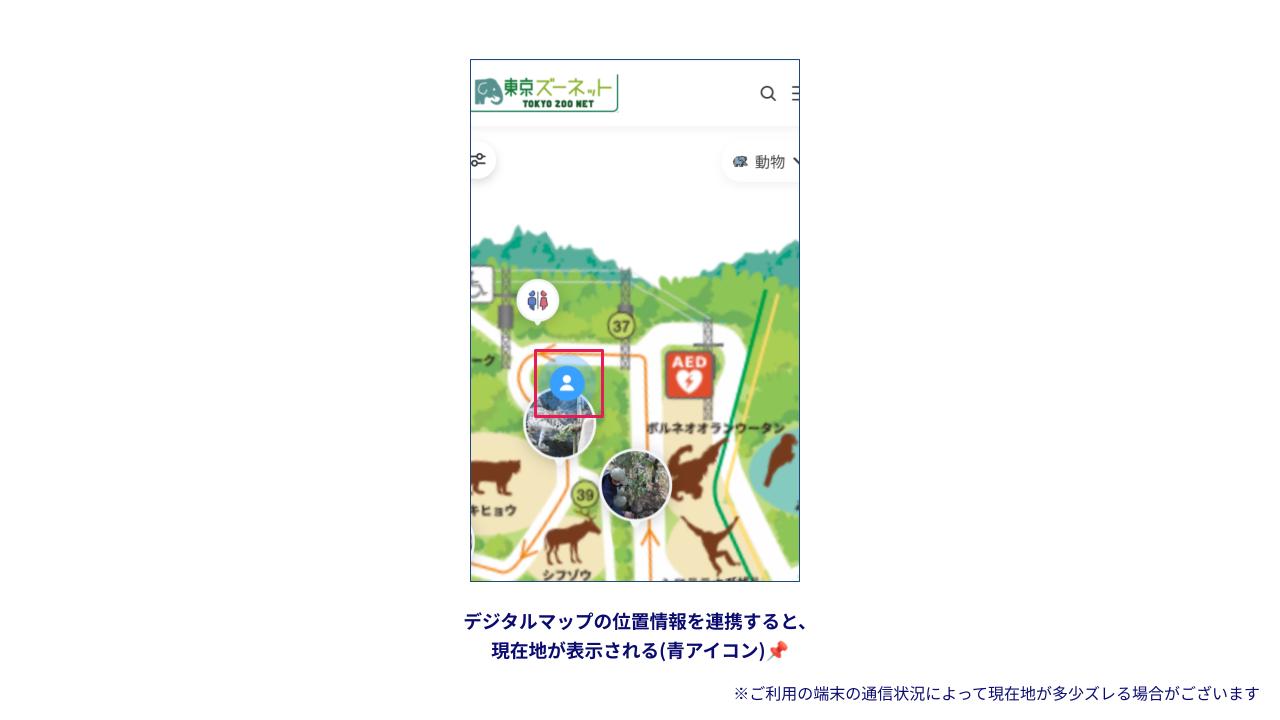 ・ご利用端末の通信状況やGPSの受信状態により、現在地の表示が実際の位置と異なる場合がございます。