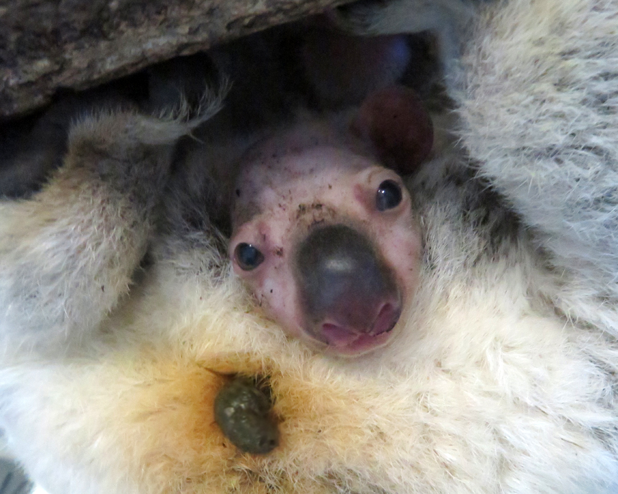有袋類であるコアラは約35日という短い妊娠期間を経て、未熟な小さい子を産みます。生まれた子はすぐに自力で母親のお腹の袋(育児嚢)までよじ登り、中にある乳首に吸い付きます。おもに育児嚢ですごすこの時期の子は嚢児(のうじ)と呼ばれます。誕生後、およそ半年経つと嚢児は袋の外に出始めるようになります。