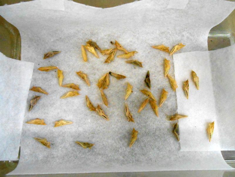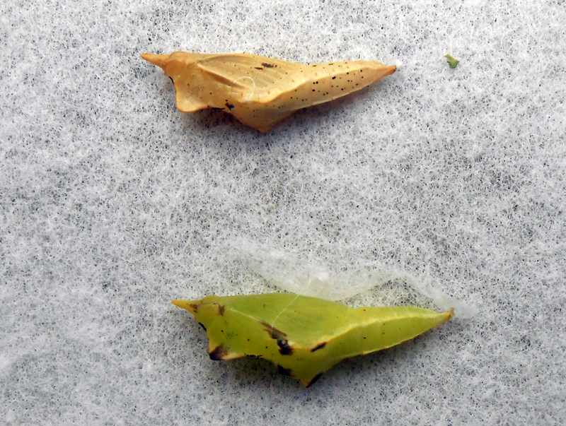 ところが昨年、晩秋を迎えた11月ごろ、順次蛹になったものの、なかなか羽化しない蛹が増えました。それまでは、緑色をした蛹と茶褐色の蛹の2種類が見られていました。蛹になる場所や気温などで体色に違いが現れていたようです。ところが、緑色の蛹を見なくなり、茶褐色をした蛹ばかりになったのです。固くて渇いた表面は「ミイラ」を思わせる蛹たちです。