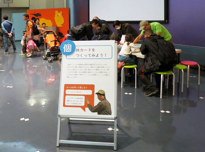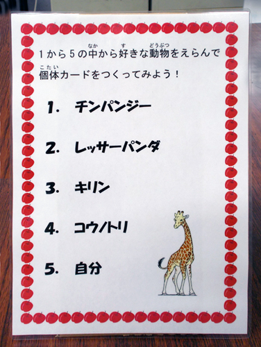 参加者は5種の中から好きな動物を1つ選んで個体カードを作ります。チンパンジー、レッサーパンダ、キリン、コウノトリ、そして「自分」。自分自身の個体カードを作るのも面白いはずと考えたのですが、「自分」を選んだ方はほとんどいませんでした。一番人気はレッサーパンダ。職員の説明を聞きながらどなたも真剣に取り組んでいました。