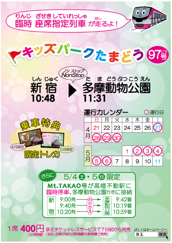 連休中の5月1日(水・祝)を除く9日間、新宿から多摩動物公園までノンストップの臨時座席指定列車が運行されます。