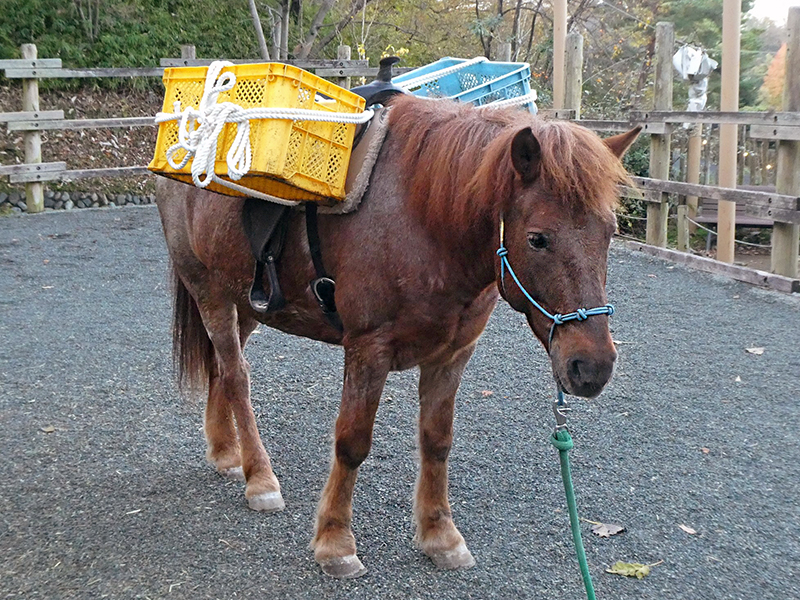 仁太郎は北海道和種という品種の在来馬です。北海道和種馬はもともと、「駄載」(ださい)で使われていた役用馬です。駄載は荷物を馬の背中に載せて運ぶ仕事を指す言葉です。北海道の開拓時代には電信柱などの荷物を運ぶことで貢献しました。現在では自動車などの普及により、馬を運搬目的で使うことがほぼ無くなり、馬に荷物を載せる技術をもつヒトも数少なくなりました。