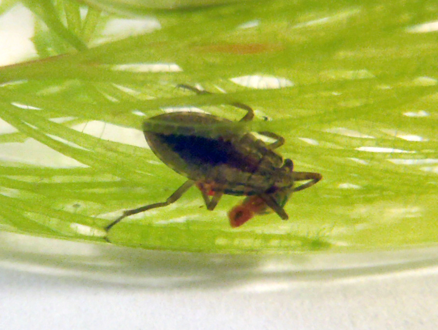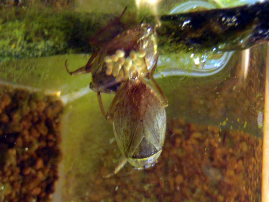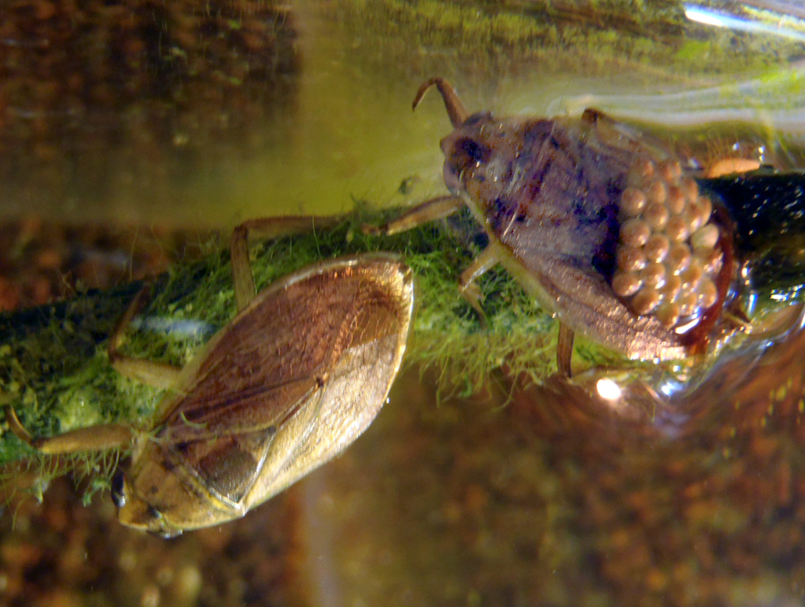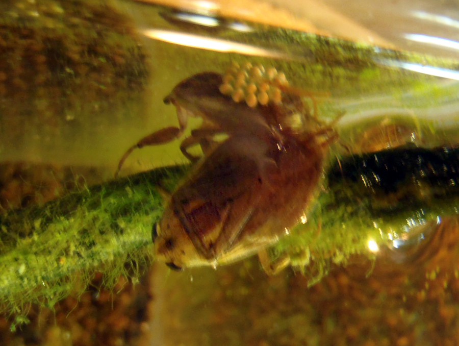 いち早く動き出したのはオオコオイムシです。オオコオイムシはメスがオスの背中に産卵し、オスは卵が孵化するまでのあいだ、背中に卵を背負って生活する習性があります(コオイムシの名前の由来です)。また、卵を背負ったオスは水面の近くにいることが多く、白い卵が目立つので観察もしやすい昆虫です。