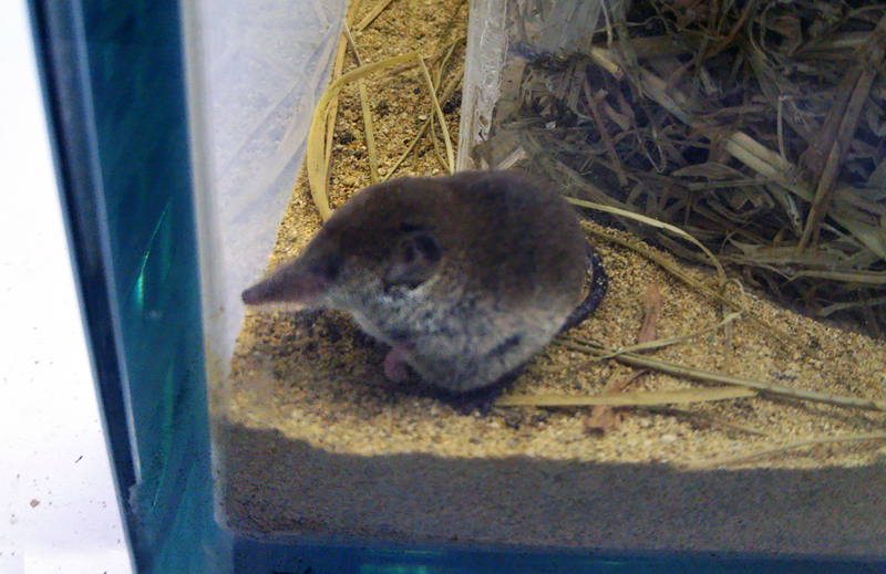 手乗りにした個体とそれ以外の個体との差は明らかでした。手乗りくんは作業時に怖がることなく出てきますが、他個体は10日ほどであまり姿を見せなくなりました。試しに手乗りくんを展示に出してみたところ、明らかに過去の個体とは違う伸び伸びとした動きが観察されました。作業する手に慣らすことで恐怖心がなくなり、展示効果が上がるというのは意外な収穫です。今も手乗りくんを展示水槽に出しているので、清掃後に手のひらに乗せているところを見られるかもしれません。 | 手のひらに乗るトウキョウトガリネズミ |