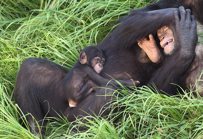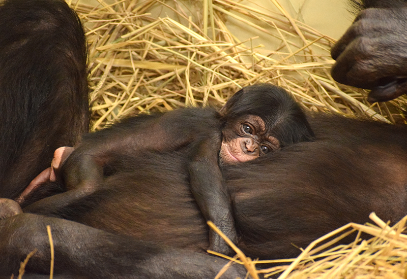 出産した子どもをミルは私たちの想像どおり、しっかりと抱いて世話をしていました。子を育てたことがないチンパンジーは育児放棄をする確率が高いといわれています。群れの中でほかの親の育児に協力していた経験もあってか、ミルの子育てはとても上手に見えました。