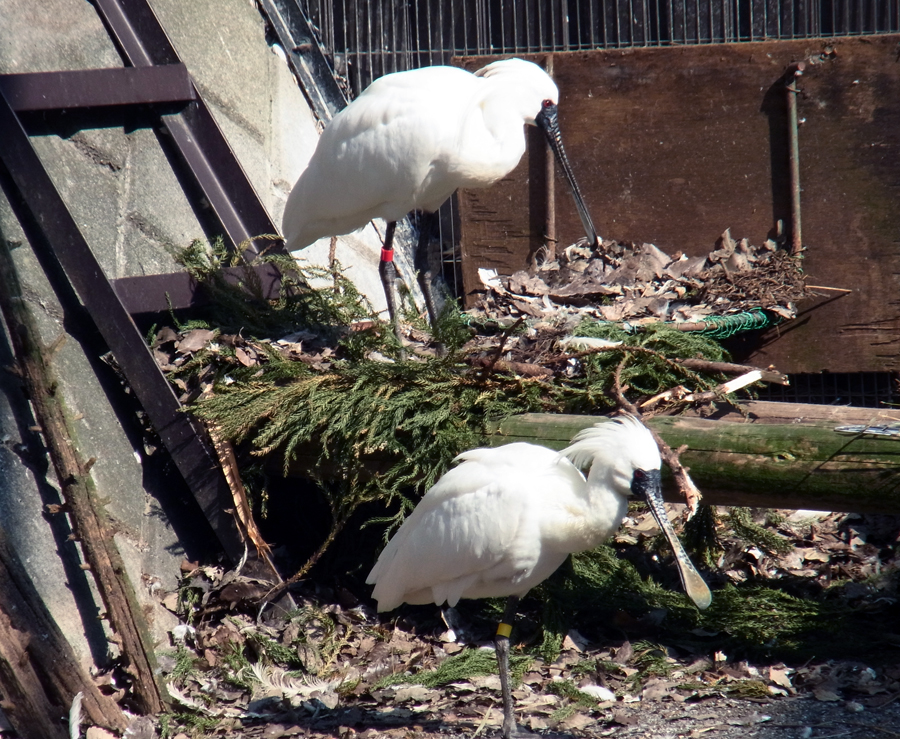 しかし、タイペイは右翼を骨折して保護されたため、飛翔することができませんでした。多摩動物公園のクロツラヘラサギの繁殖ケージは巣台までの高さが3メートルあり、交尾も巣台でおこなわれます。飛翔できないタイペイには不利な環境でしたが、巣台を低くしてみたり、交尾相手となるメスが低い巣に留まるようにしたり、私たちは工夫を重ねました。