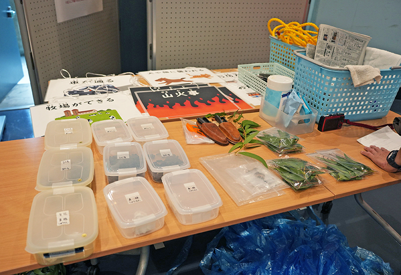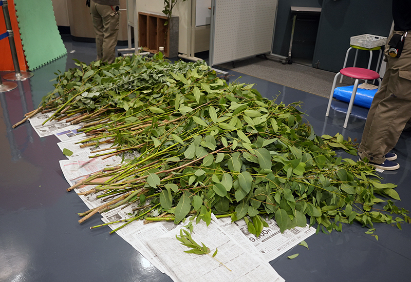 コアラ飼育担当者によるコアラの説明では、いろいろな標本の匂いを嗅ぐ体験を要所に導入しました。事前にユーカリを大量に集め、会場内にはユーカリの匂いが立ち込めていました。コアラのえさとなるユーカリのうち三種類の匂いを嗅ぎ分け、正解のユーカリをあてるクイズをおこないました。なかなかユーカリの匂いを嗅ぎ分けられるヒトは少なく、正解率は低かったように感じますが、コアラの匂いを嗅ぎ分ける能力を体感できたのではないでしょうか。