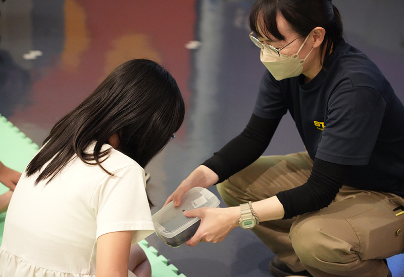 えさのユーカリだけではなく、フンや尿、オスの臭腺から出る分泌物も用意しました。穴を開けたタッパーを軽く押し、中から匂いが充満した空気が噴出するというものです。「ワー!」「キャー!」と言いながらも、楽しそうに臭いを嗅いでおり、保護者の方も子どもたちと同様に「臭い」「思ったよりもいい匂い」「ユーカリの匂い」という意見が分かれる結果になりました。