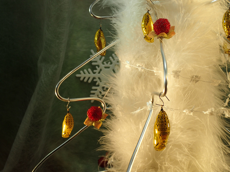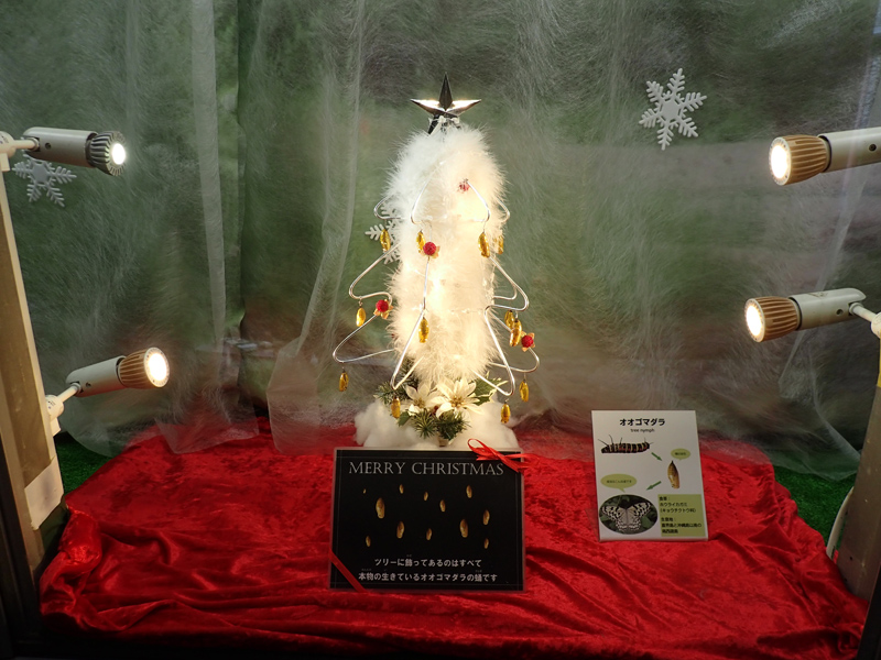 今年は銀と白を基調にした大人な雰囲気のツリーをつくり、金色に輝くサナギが一段と映えるように工夫しました。いつ見てもきれいなサナギですが、クリスマスはちょっと特別に見えるかもしれません。まるで飴細工のような美しさをぜひご覧ください。
