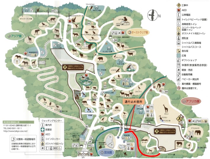 2018年10月2日(火)は昆虫園からアフリカ園への迂回路(チーター、サーバルの裏の道)を通行止め