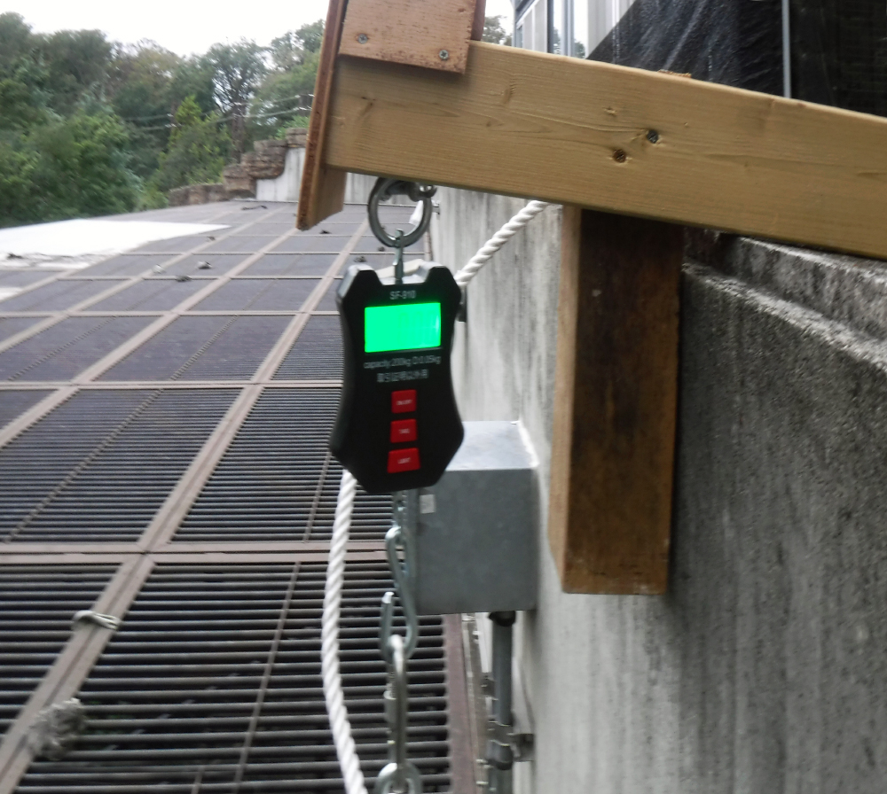 ヒトの体重計のように床に置くタイプでは壊される可能性があり、別の方法を考えました。シロテテナガザルの展示場の外に「吊りはかり」(測定器のフックに測定物を吊り下げて計量する装置)を設置し、そこからロープを垂らし、それにつかまってもらい体重を計るというものです。