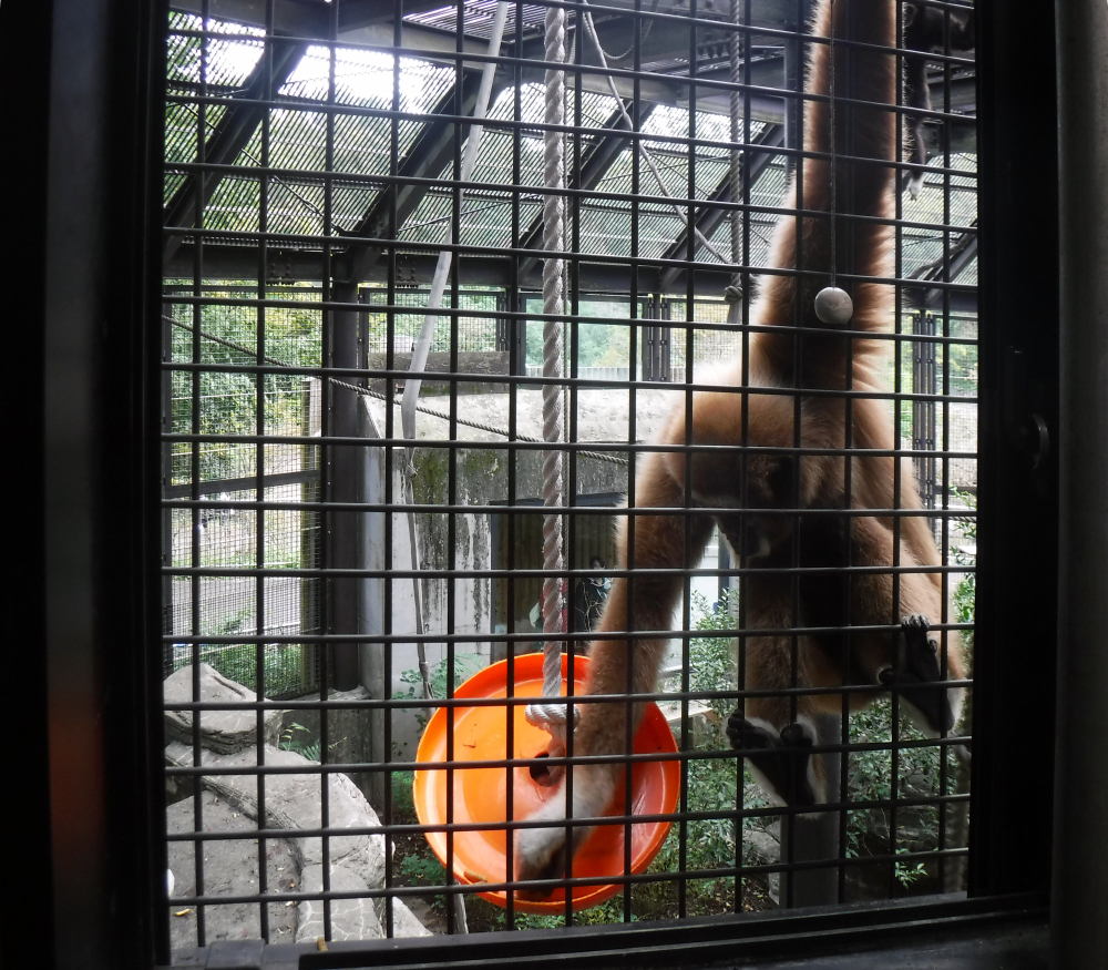 4月に私がシロテテナガザルの担当になった際、前任者から3頭ともとても神経質な個体と聞いていました。実際に飼育を始めると、少しの環境の変化でも部屋に戻らなくなるなど聞いていたとおりでした。そこで、しばらくはできるだけ環境を変えずに、彼らの行動を観察することにしました。