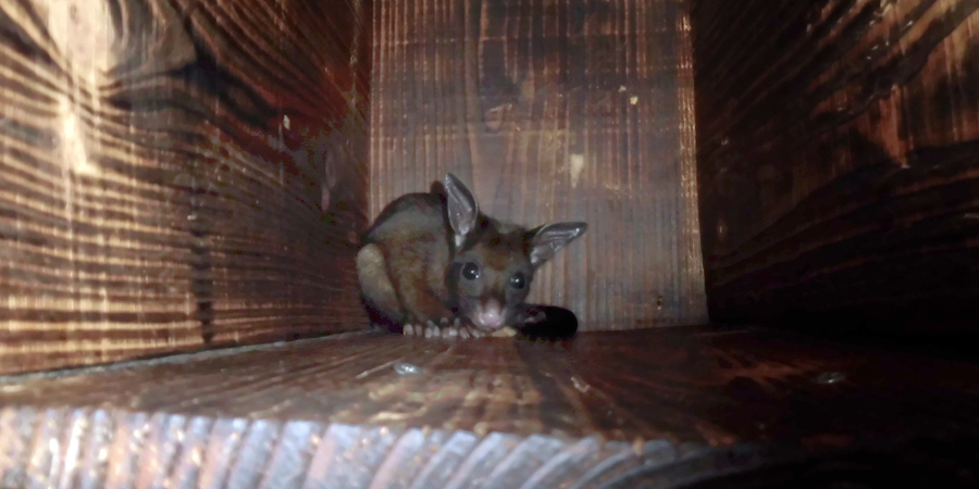 その後、袋はさらに膨らみ、2018年2月ごろには子どもの尻尾や肢の先が袋からひょこっと出ていることがありました。順調に成長しているようです。2月18日の朝、エシャロットが巣箱の上に座るようにして、しきりに巣箱の中を気にしていました。中を覗くと子どもがいました。出袋(しゅったい)です。多摩動物公園では、フクロギツネやカンガルーについて、初めて母親の袋から全身が出た日(出袋日)を誕生日として記録しています。