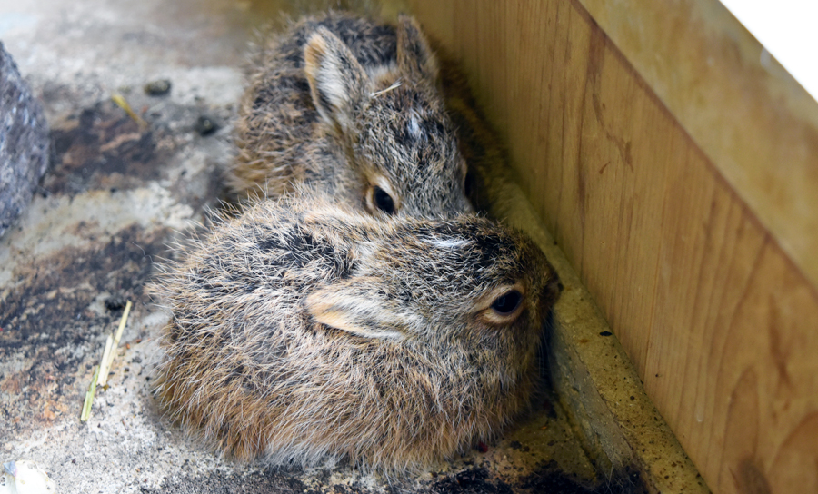 ノウサギは生まれたときから目は開き、毛も生えていて、約1時間後には走ることができます。誕生の翌日、2頭の体重を測ったところ、118グラムと144グラムでした。およそ片手に乗るくらいの大きさです(1頭は残念ながら生後10日目で死亡しました)。