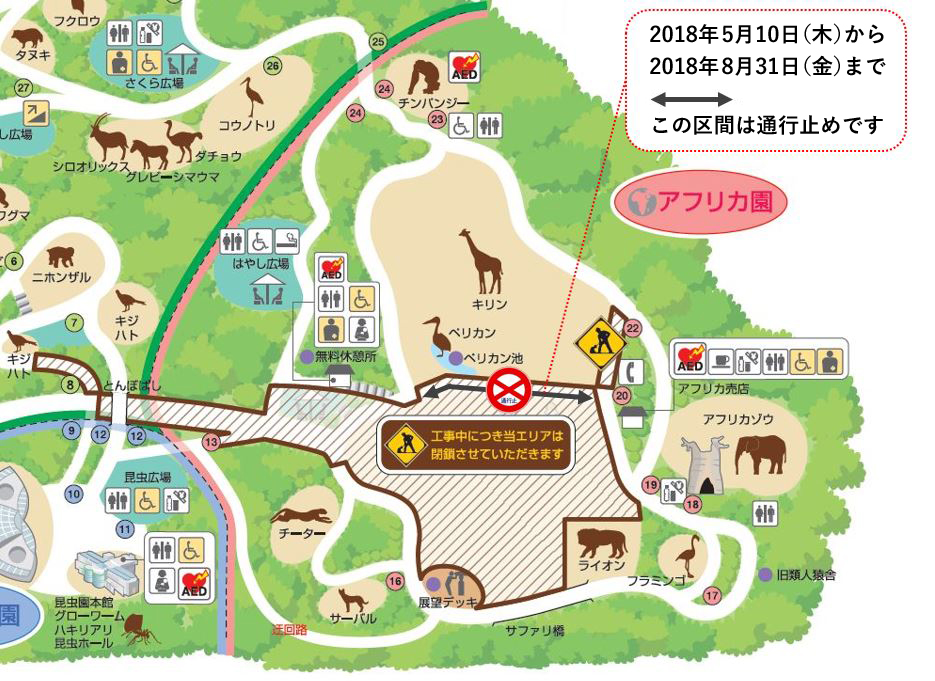 5/10-8/31 工事のため、アフリカ園ペリカン池前通路が通行止めになります