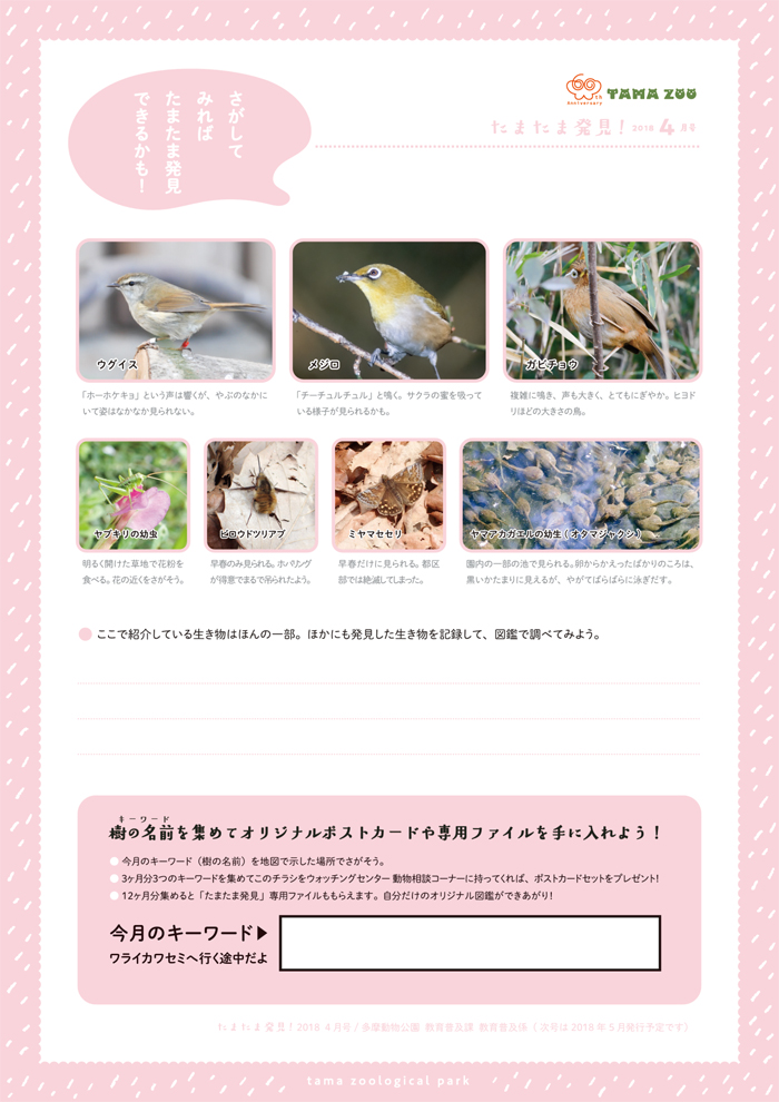 毎月発行の「たまたま発見!」には、キーワード(樹の名前)を集めてオリジナルのポストカードを手に入れるというお楽しみ付き。ぜひガイドを手に取り、展示動物をご覧いただくあいまに、雑木林の自然にも目を向けてみてください。
