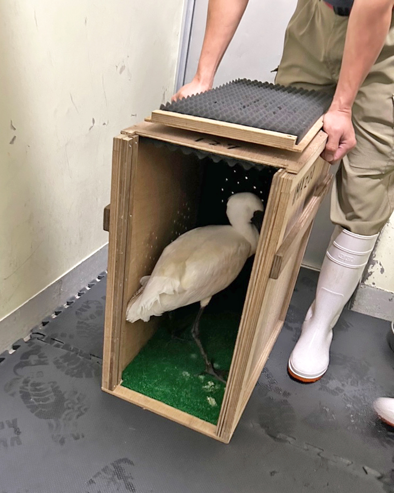 野外で保護されたクロツラヘラサギの来園)これらの個体は環境に慣れたあとに、園内の繁殖棟でペアを作り、繁殖を目指します。