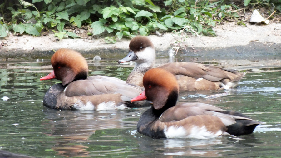 おとなのアカハシハジロ(手前2羽がオス、奥の1羽がメス)