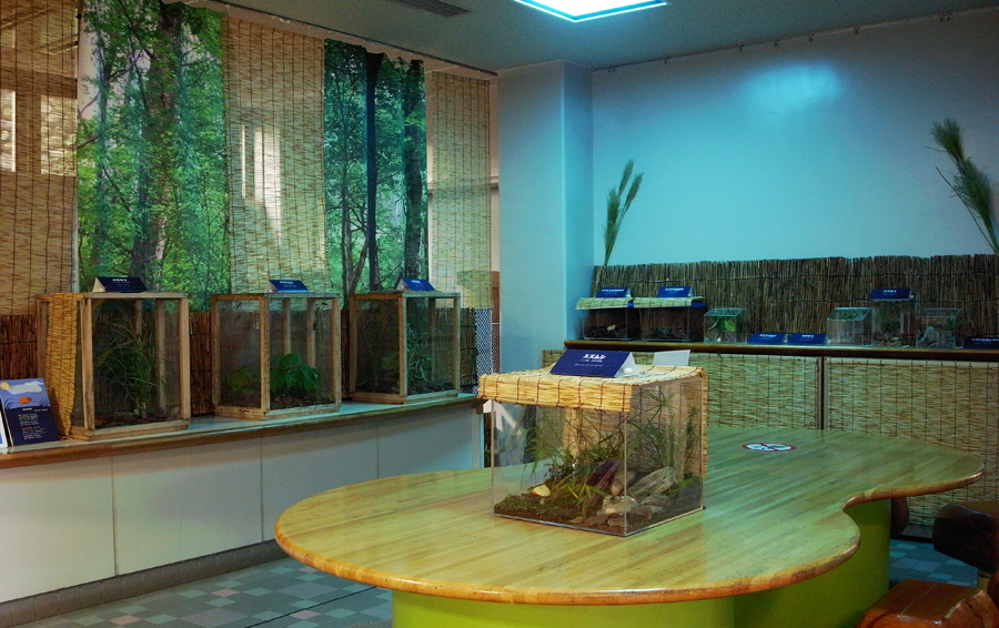 多摩動物公園で毎年恒例の「秋の鳴く虫展」ですが、今年は虫たちの生の声をお届けすることを中心とした展示です。会場の明るさを虫たちが鳴き始める薄暮の時間帯の明るさに落とし、照明の色も青くして秋の涼しさを再現しています。