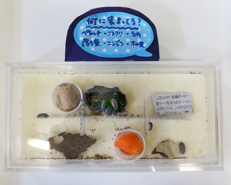 多摩動物公園での展示テーマは「ダンゴムシの好きな食べ物・場所を知ろう」です。ペレットやコンクリ、紙、落ち葉ニンジン、木の皮など、どのえさにダンゴムシが群がるか、かわいた場所としめった場所のどちらに集まるか、暗いところと明るいところのどちらにいるか──など、ダンゴムシの行動を実際に観察することができます。