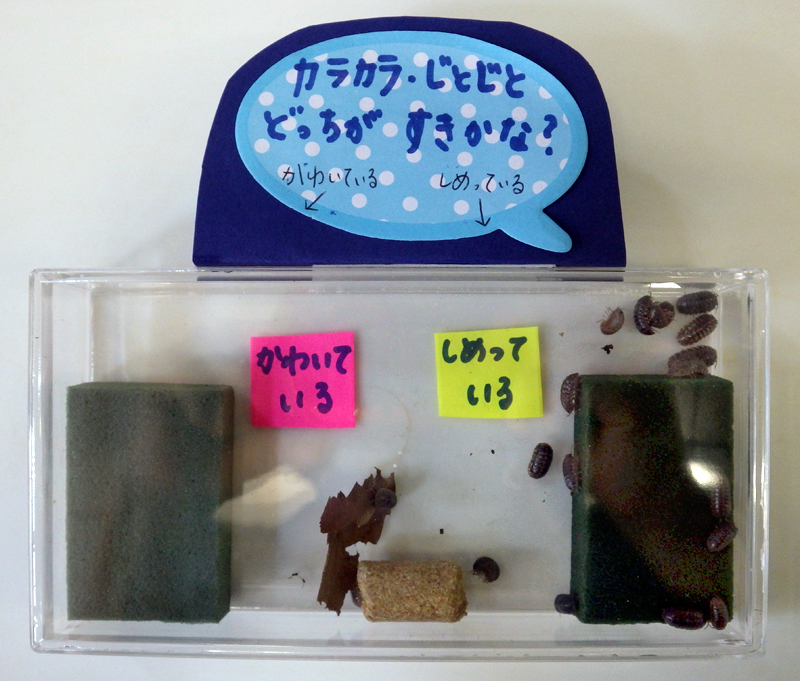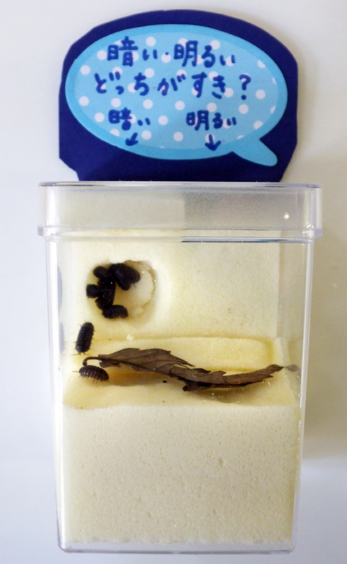 多摩動物公園ではダンゴムシの簡単な実験展示をおこなっています。その展示を参考にして、アレンジしてみるのもおもしろいと思います。