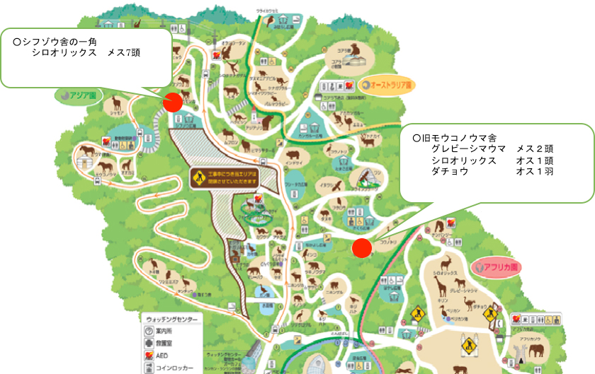 今回の移動に伴い、旧モウコノウマ舎(なかよし広場上の以前モウコノウマがいた放飼場)にグレビーシマウマ2頭、シロオリックス1頭、ダチョウ1羽が移動し、シフゾウ舎の一角にシロオリックス7頭が移動しました。