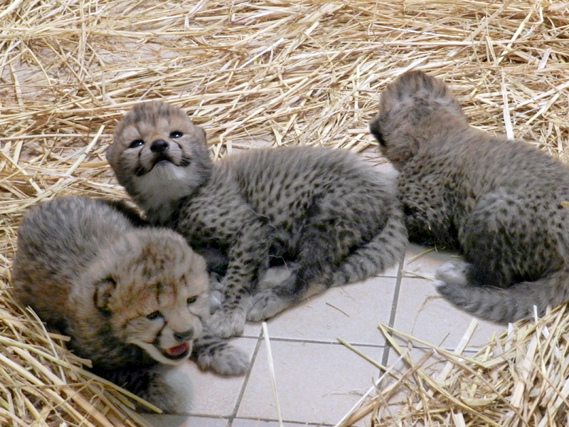 | 生後10日目。左からジョラス、クラリス、アイガー。2017年2月14日撮影 | ガラス放飼場にデビューしたチーター三つ子。手前からジョラス、クラリス、アイガー。2017年4月12日撮影 |