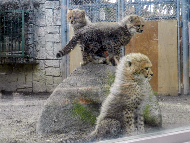 2017年2月5日に多摩動物公園で生まれたチーターの三つ子、オスの「アイガー」と「ジョラス」、そしてメスの「クラリス」。ガラス窓のある「ガラス放飼場」に無事デビューしたのが生後2か月頃でしたが、それから早くも1か月ほどが経ちました。