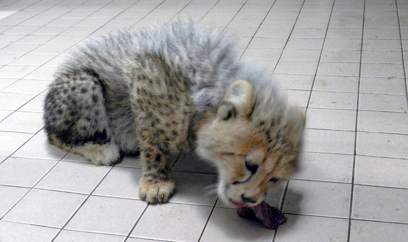 生後10日で1キロ程度だった体重も今では約5キロを超えるまでに成長しました。70日を過ぎた頃から母親「シュパーブ」の食べている馬肉や鶏頭を食べ始めるようになり、母親が子に餌をゆずってしまうため、室内に入れた後、親子別々の部屋で給餌するようにしています。