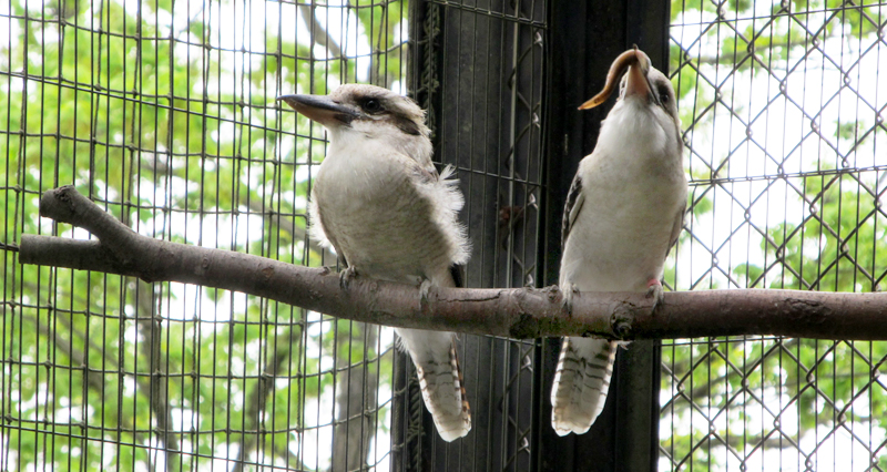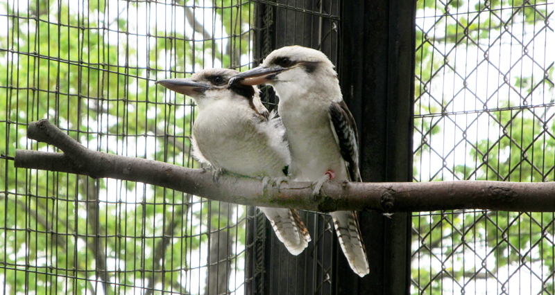 春は恋の季節。現在、多摩動物公園のワライカワセミ舎には2組のペアがいますが、オスの「ロゼ」はメスの「キイロ」に熱烈なアタックの真っ最中です。アタックの手段は、えさのドジョウのプレゼント。
