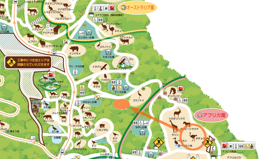 多摩動物公園ではアフリカ園のキリン舎で耐震工事をおこないます。これにともない、サバンナエリアで展示していたオスのダチョウ1羽を当面のあいだ、「コウノトリ舎」(案内番号26)と「なかよし広場」(案内番号27)のあいだの放飼場に移動し、公開しています。下記地図をご参照ください。