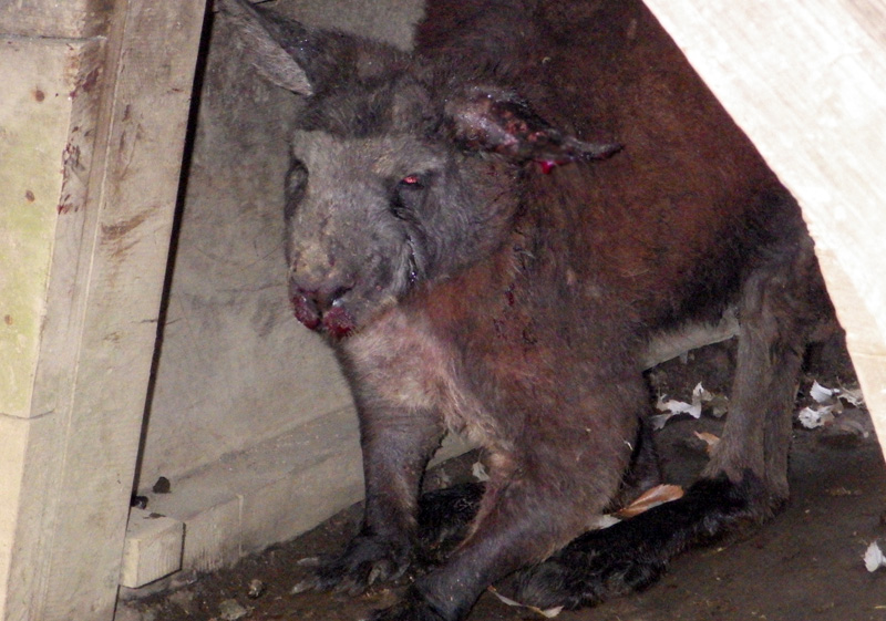 ことの始まりは昨年(2016年)12月、「オスのワラルーの顔が腫れて血も出ている」と飼育担当者から受けた連絡でした。急いで向かうと、そこには顔がパンパンに腫れあがったケナガワラルーが1頭たたずんでいました。群れの中でいちばん強かったリクですが、最近力をつけてきた「チャジロウ」にケンカで負けてしまったのです。