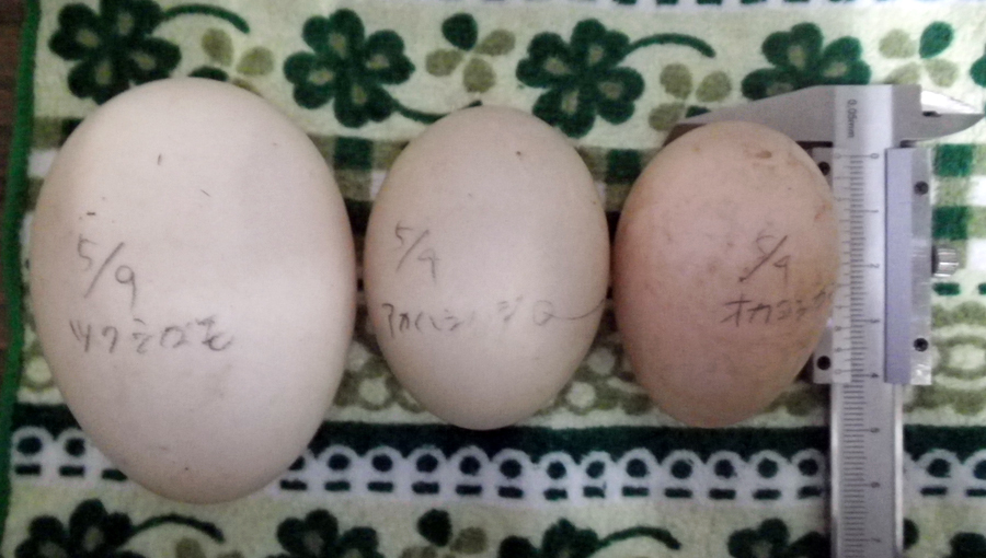 左からツクシガモ、アカハシハジロ、オカヨシガモの卵