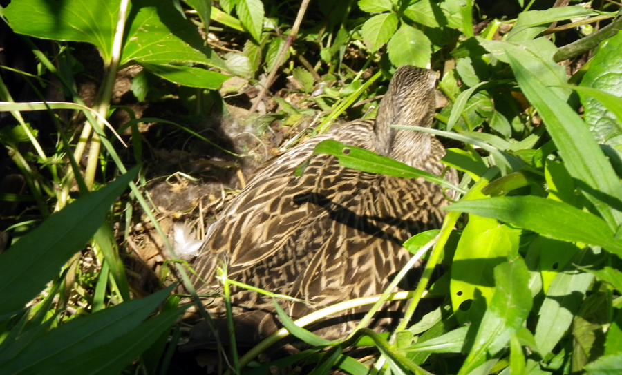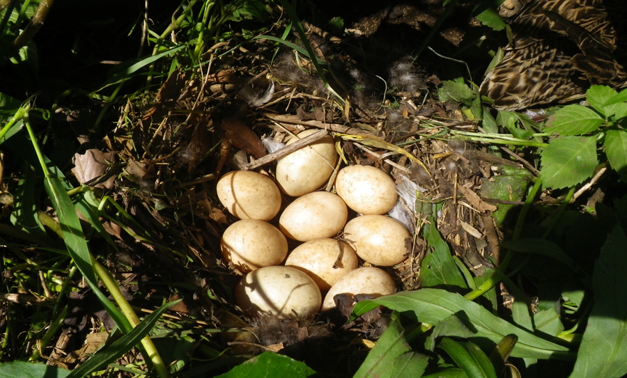 5月18日の朝、オカヨシガモのメスの姿が見あたらず、草むらの中をはいつくばって探すと、池の脇に巣を作って抱卵していました。卵は9個あり、よくよく見てみるとそのうちの2個はアカハシハジロの卵でした。一所懸命抱いているオカヨシガモには申し訳なかったのですが、親にはどいてもらい、卵をすべて採取しました。
