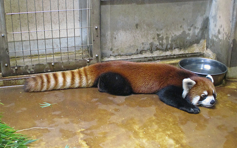 夏は食欲も落ちます。暑さだけでなく、与えている竹のモウソウチクがこの時期は若葉であることも理由のひとつです。意外にもレッサーパンダは竹の若葉はあまり好まないのです。週に1回の体重測定でようすを見ながら、体重が減っていればリーフイーター用ペレット(葉食いサル用の人工飼料)の量を増やしたりして調整します。