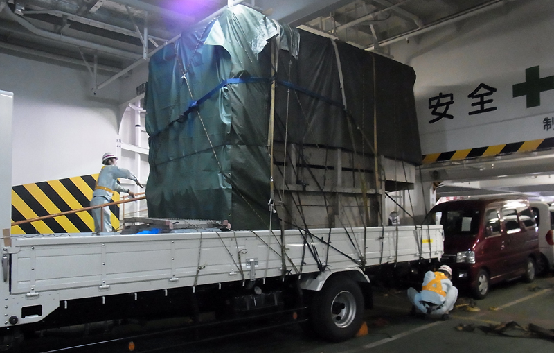 3月24日朝、輸送箱に入れられたワビスケはトラックに載せられ、陸路で鹿児島新港へ向かいました。私は別経路で港に向かいましたが、輸送業者の話では一度だけ広島付近で休憩したそうです。当時、日中は暖かい日もあったのですが、よりによって出発翌日の朝は一段と冷え込み、広島の最低気温はマイナス5℃、ワビスケが経験したことのない寒さになったため心配しました。しかし、体調等に変化は見られないとの報告を受け一安心しました。
