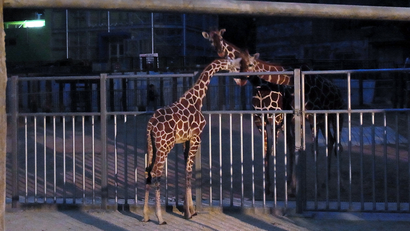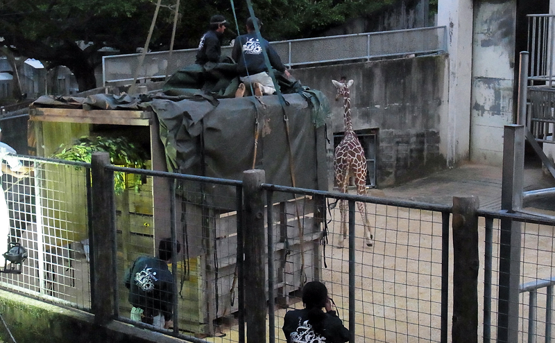 沖縄こどもの国にも当然キリン舎はありますが、冬場でも暖かいので部屋に入れる習慣がないとのことでした。そのため、放飼場に輸送箱を置き、飼育係もいる状態で外に出すという荒わざ!?に少々驚きましたが、ワビスケはそんなことは気にもせず、輸送箱から出るとまず水を飲み、遠くにいるメス2頭を気にするようにせわしなく柵沿いを行き来し始めました。そこでメス2頭と柵越しに触れ合えるようにしたところ、ようやく落ち着きを取り戻しました。