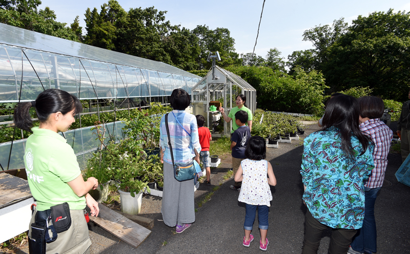 チョウの飼育エリアでは植物を世話する際の工夫や苦労をお伝えし、たくさんの蛹が羽化を待つようすをじっくり見ていただくとともに、幼虫や蛹も直接触って観察していただきました。