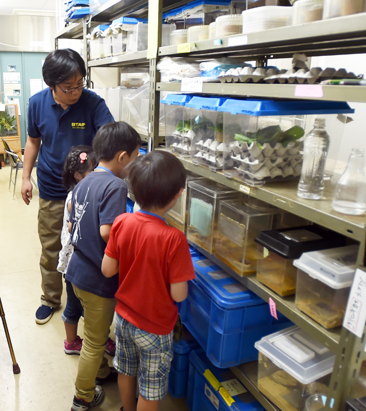 その後、バックヤードツアーへと向かいました。3班に分かれて少人数での見学です。テラリウム(本館2階)では、外国産のカブトムシの幼虫に触ったり、外国産のサシガメへのえさやりを間近で見てもらいました。バッタの飼育室では、ふだん展示していない個体数の多さに驚かれているようでした。また、特別にバッタの卵鞘を砂の中から取り出して見ていただきました。