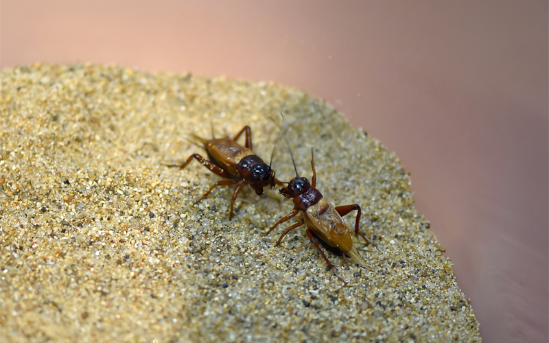コオロギ相撲は、コオロギのオス2匹を闘わせて勝敗を競う遊びです。2匹をケース内でいっしょにすると、おたがいが見合い、触れあったりした後、1匹が退くことで勝敗が決まります。傷つけ合うわけではありません。