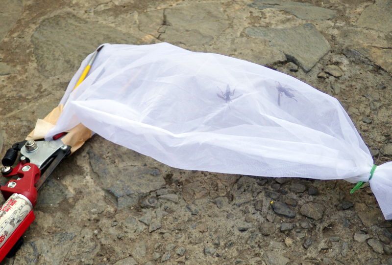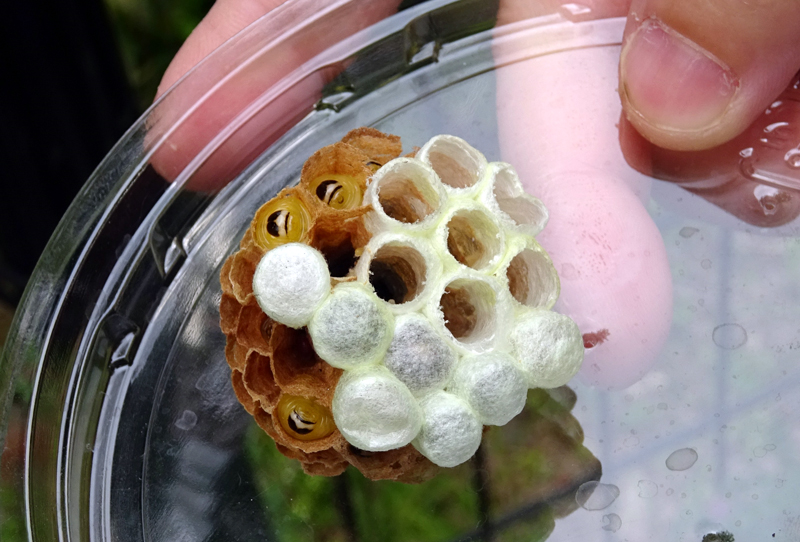 さっそく草むらの中にコアシナガバチの巣を見つけたので、薬を使わずに採集することにしました。高枝切りバサミの先に袋を取りつけて巣へと伸ばし、袋をかぶせて根元からきれいに採集することができました。巣はまだ小さく、ちょっと物足りないかしらと思いながらも、飼育担当者に渡してハチクマに与えてもらいました。