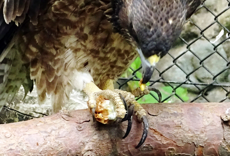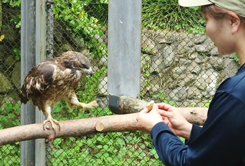 ハチクマはテレビの動物番組などで紹介されることもあるのでご存知の方も多いと思いますが、夏に日本や韓国などで子育てをし、冬は東南アジアに移動する渡り鳥です。保護されたハチクマは推定1歳のメスで、足をケガしており、野生に戻すことが難しいので多摩動物公園に来園しました。