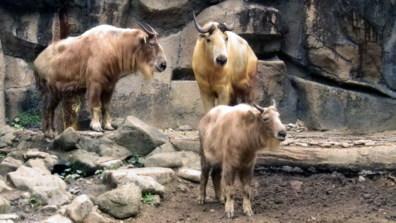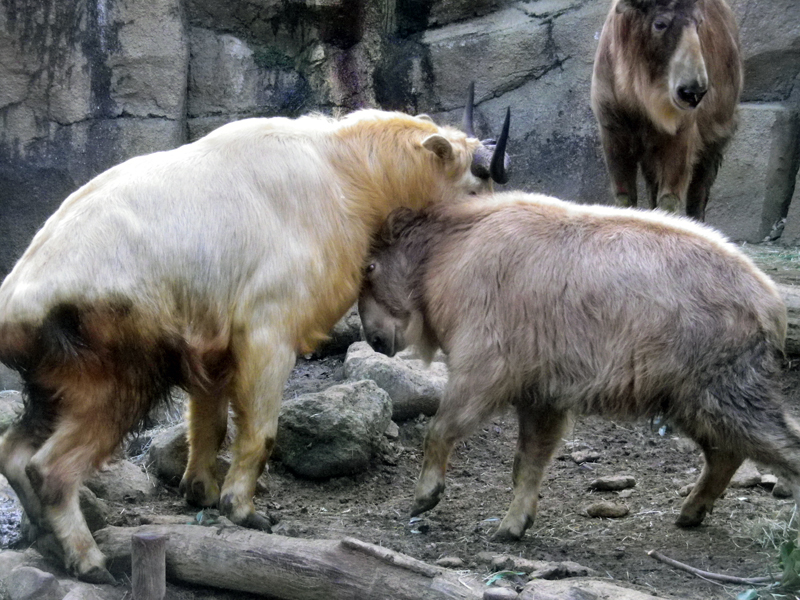 オスの「オウテン」(鶯巓)は2010年生まれで、「ゴールデン」ターキンの名のとおり、美しい金色の毛をしています。メスの「ホイ」も2010年生まれです。もう1頭のメスの「レイカ」は2014年3月生まれで、ホイの子です。いちばん若いレイカは3頭の中では体の大きさがいちばん小さく、角もまだ成長途中で小さめなので、すぐに見わけられます。