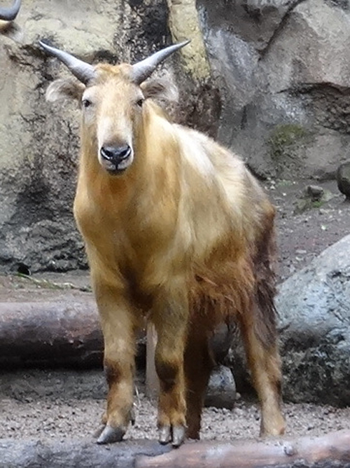 ゴールデンターキンはウシ科の動物です。種和名は「ターキン」ですが、亜種は4種が知られています(アッサムターキン、ブータンターキン、スーチョワンターキン、ゴールデンターキン)。ゴールデンターキンはおとなのオスの体毛が金色(ゴールデン)に見えるので、その亜種名がつけられました。分布は中国陝西省秦嶺山脈、甘粛省東南部。標高2,400〜4,200メートルの高山にくらしていますが、開発により数が減り、中国ではジャイアントパンダやトキなどとともに「第一級保護動物」に指定されています。